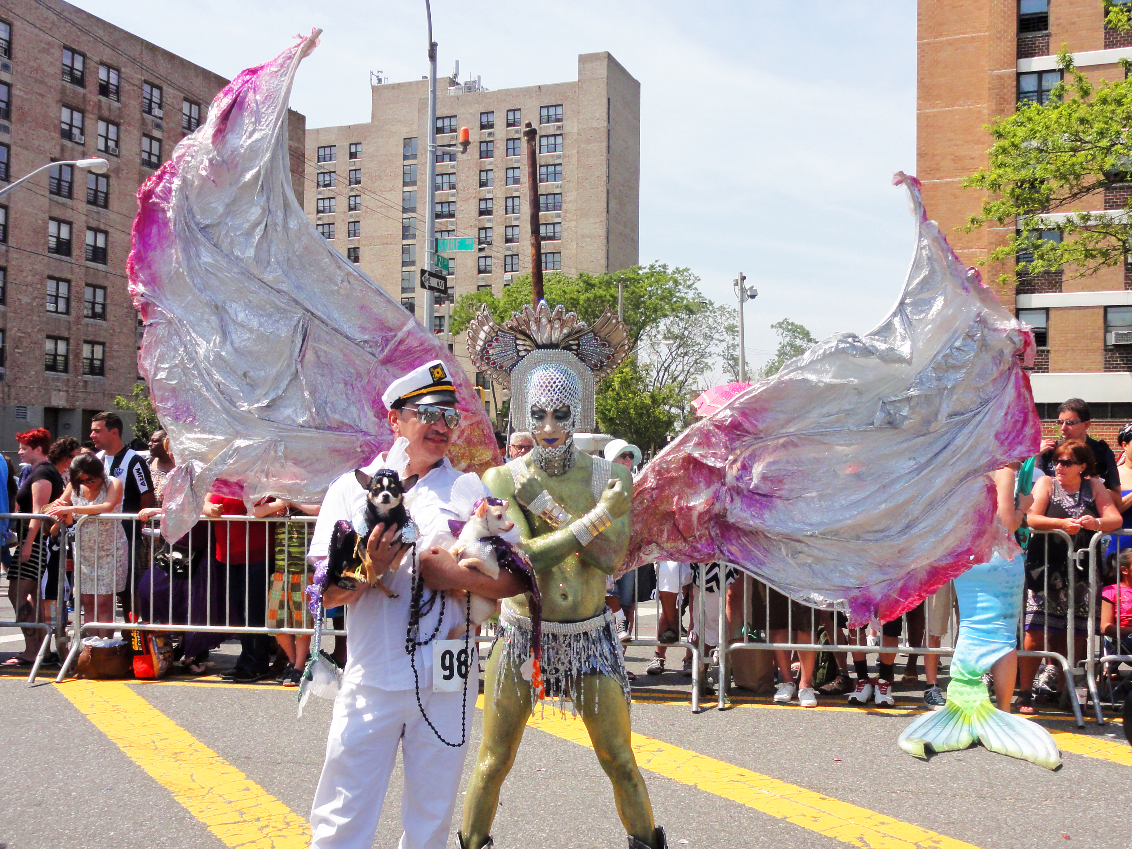Exciting day participating in the historical 2013 Coney Island Mermaid Parade. Captain Anthony Rubio and his sea dogs Bogie and Kimba at full attention. Their outfits were designed by Anthony Rubio or Bandit Rubio Designs.