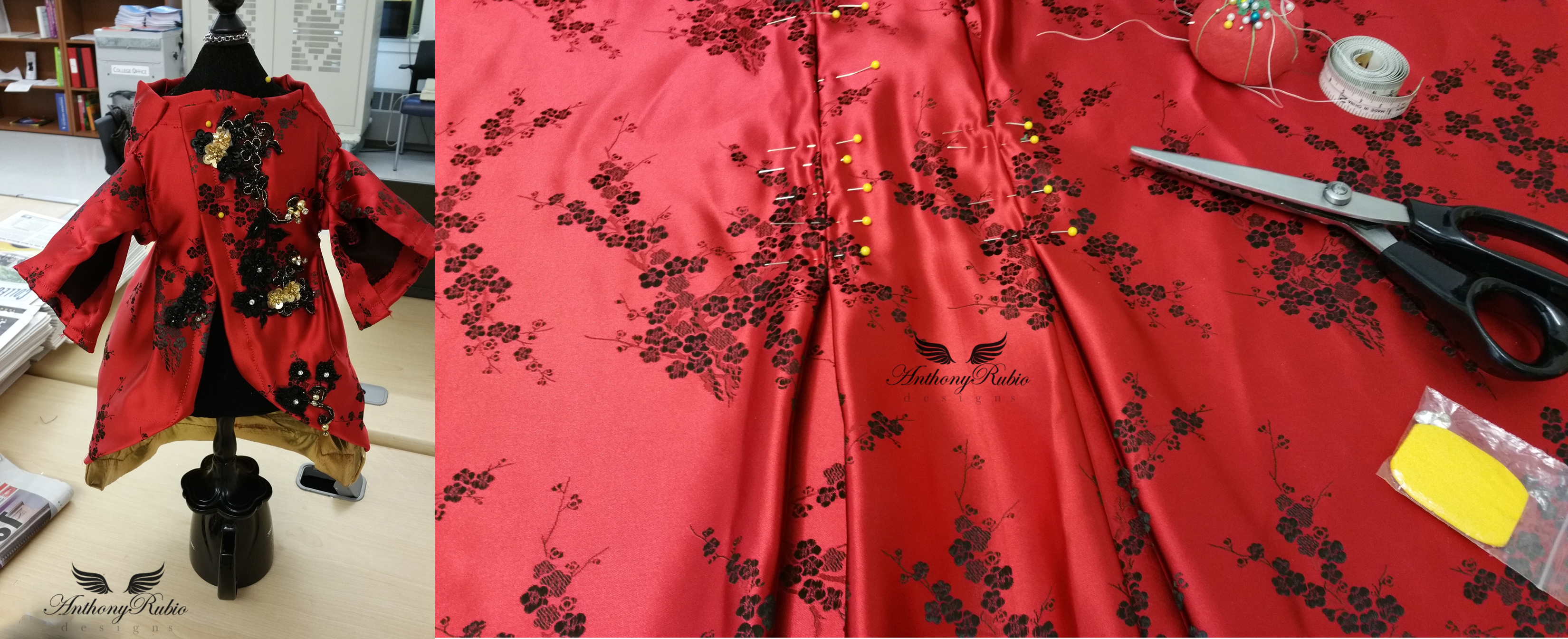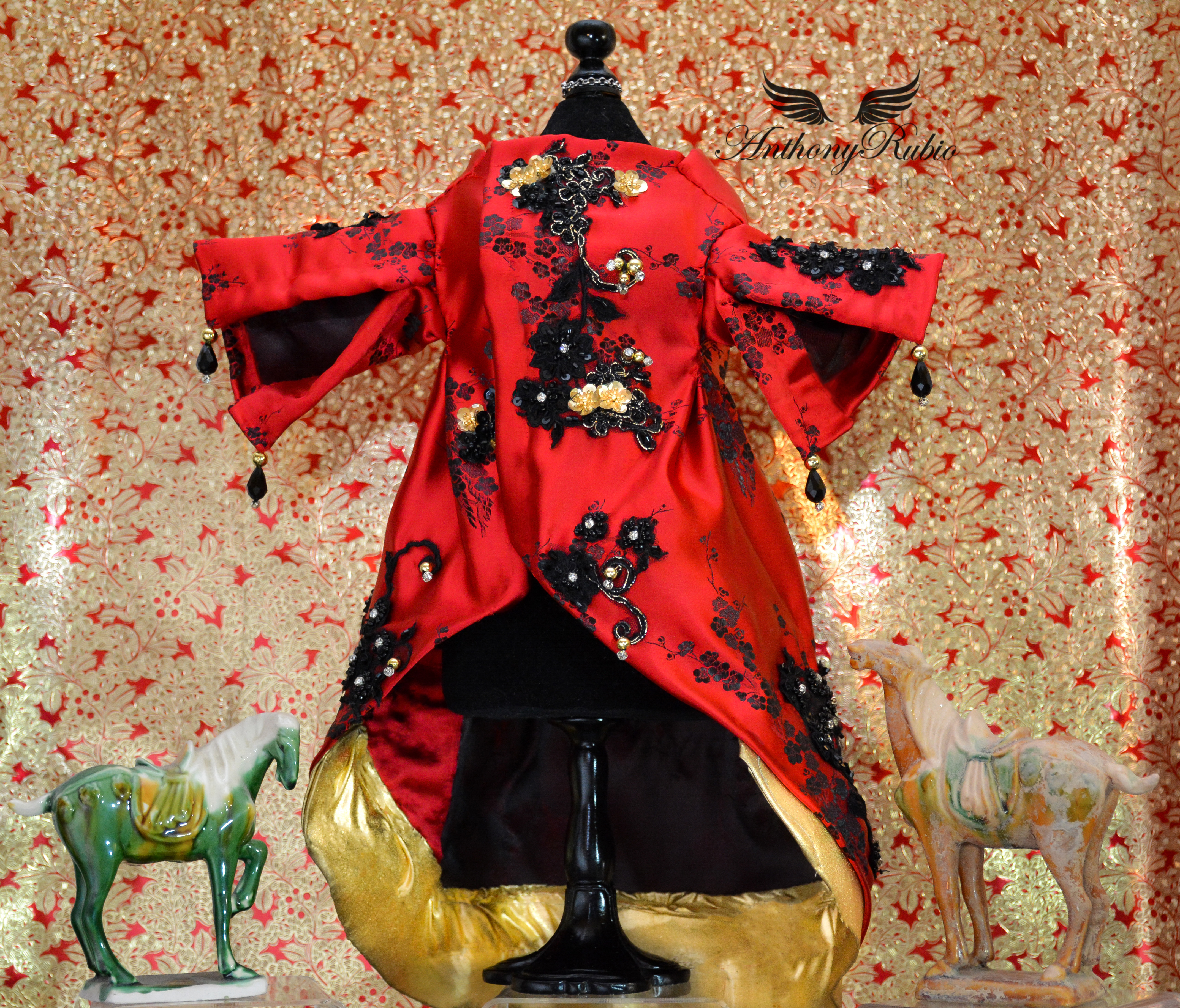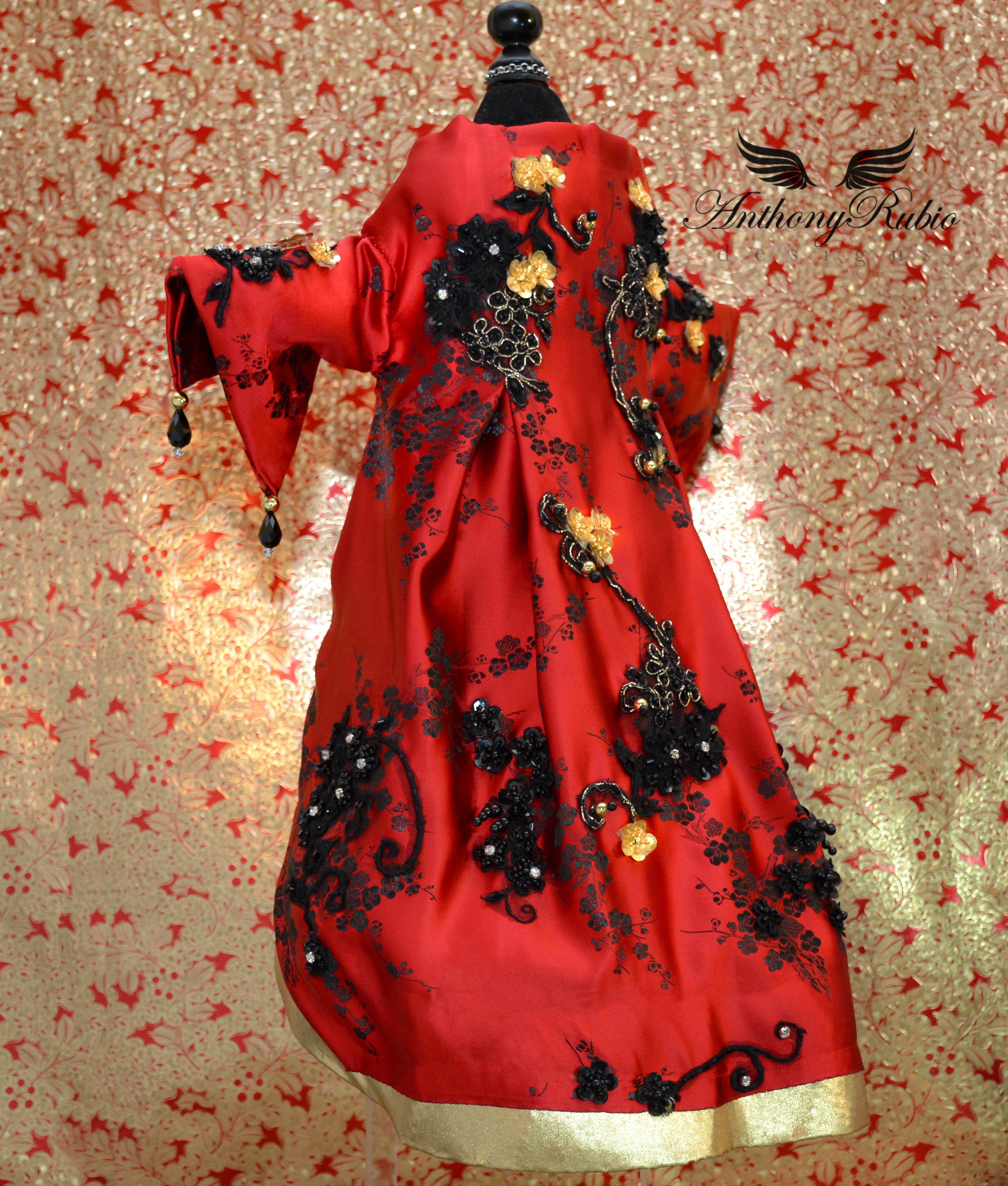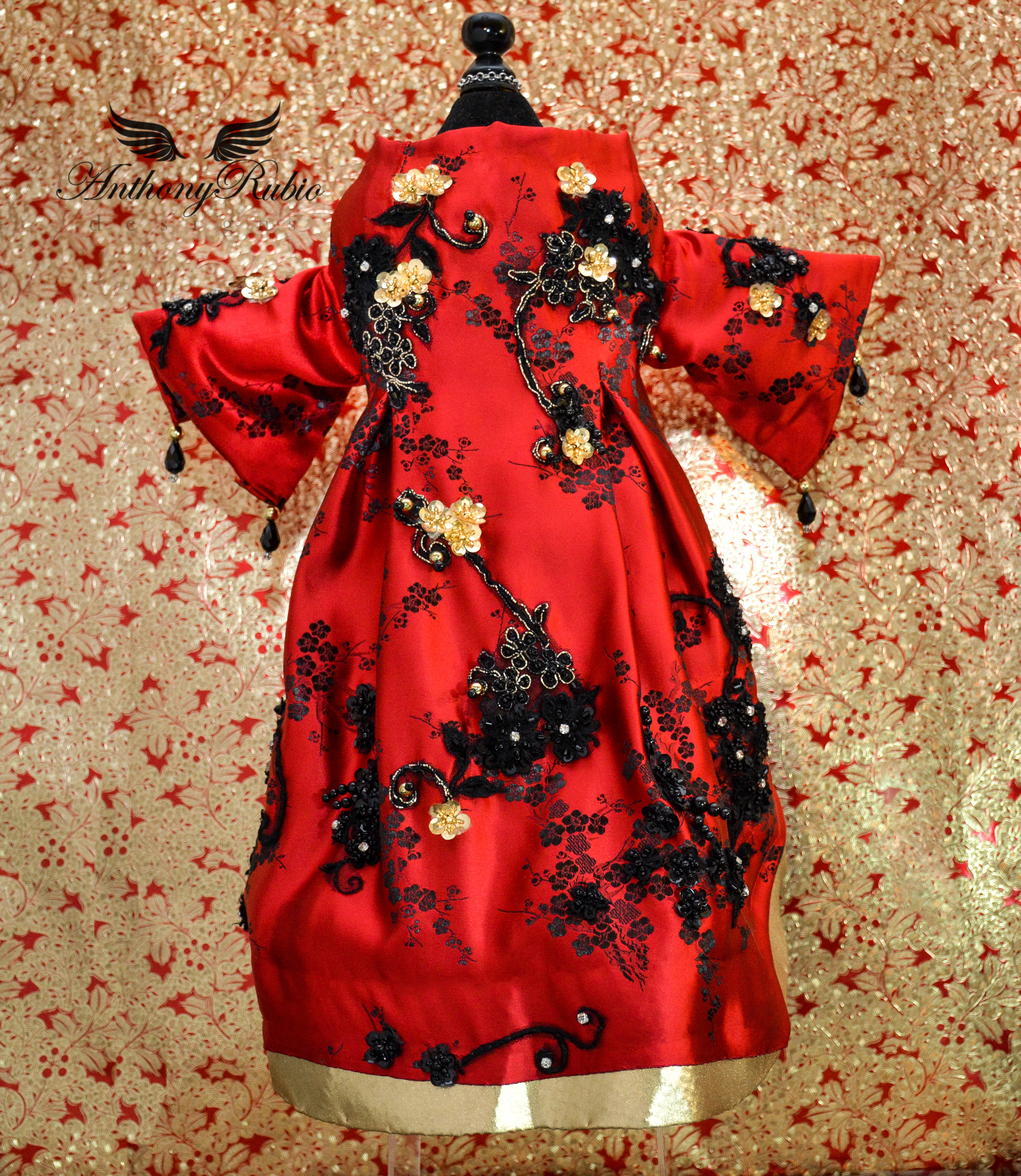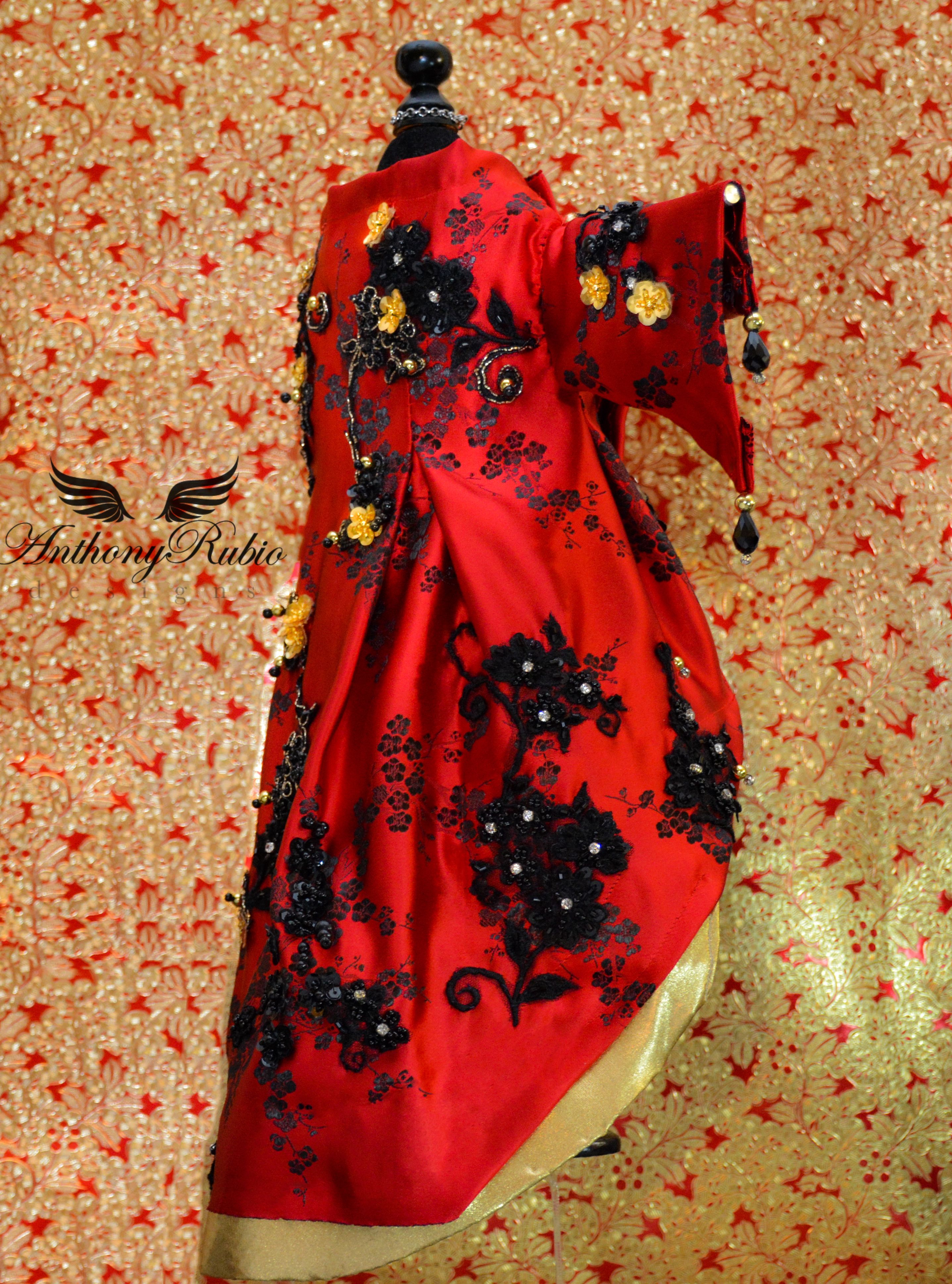 From the moment he layed eyes on the much anticipated ensemble worn by actress Sarah Jessica Parker, a co-chair of this event, Anthony knew he had to capture the magnificence that was the ceremonial headdress created for this occasion by artist/milliner Philip Treacy. Anthony Rubio then decided to create a silk robe suitable for an Asian Emperor. A magnificent red silk fabric featuring blossoms woven in black silk was the starting point for this magical work of art. Utilizing his tailoring skills creating a comfortable and regal silhouette the robe took form. The final steps of hand embellishing the garment came in the form of embroidered floral patterns featuring glass caviar beads and mounted crystals. The finished garment is an actual work of art.