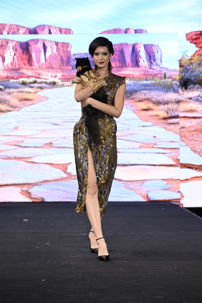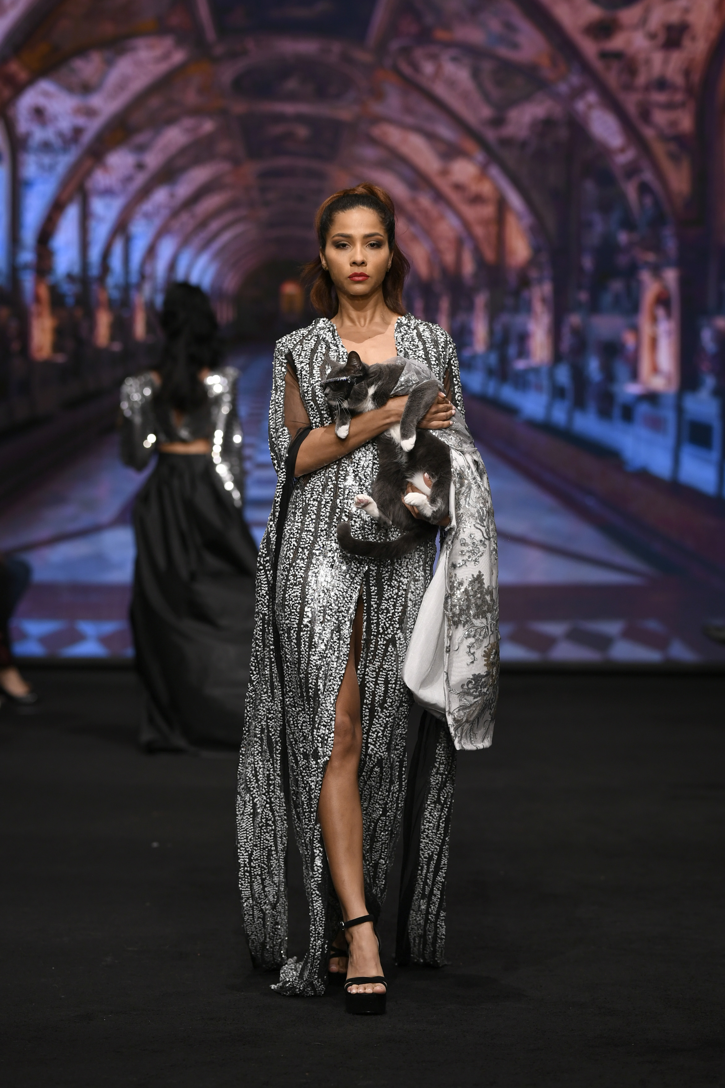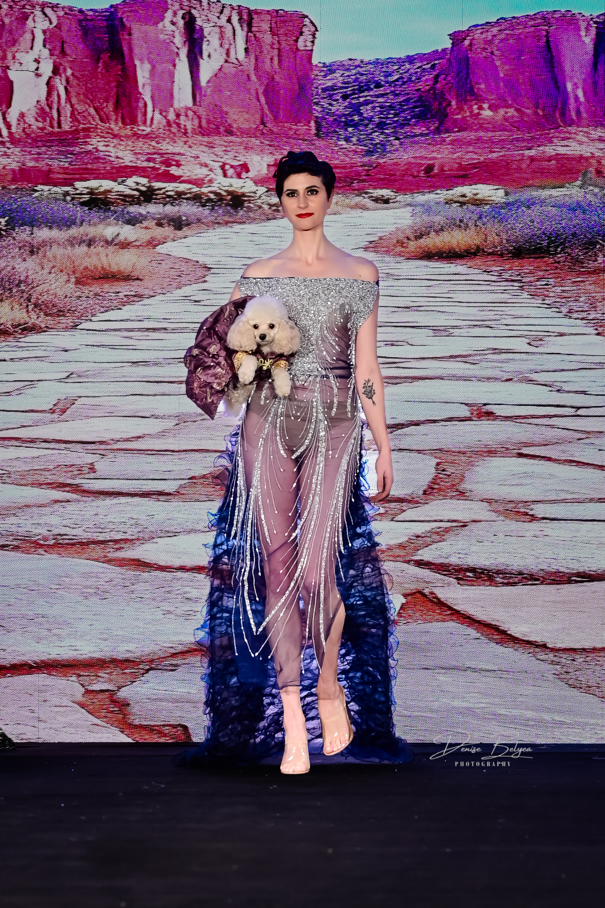The show stopping moment was my introduction of the first ever cat as a model on the catwalk. Instagram famous and fashion influencer Sunglasses Cat flew in from the West Coast just to make her catwalk debut modeling her favorite designer Anthony Rubio Designs. Her dress featured floral embroidery of gold and silver and lavender on grey chiffon.