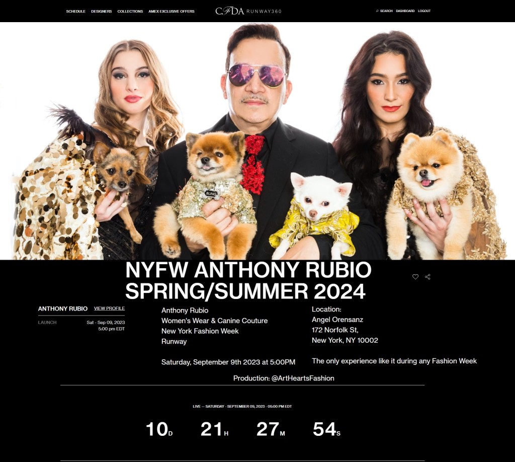 Anthony Rubio was the first to present canines as models and not as accessories in any Fashion Week starting in New York. He designs and presents women’s wear and men’s accessories designed to coordinate with the creations for the canine models. Together they present a fashion show like no other.
