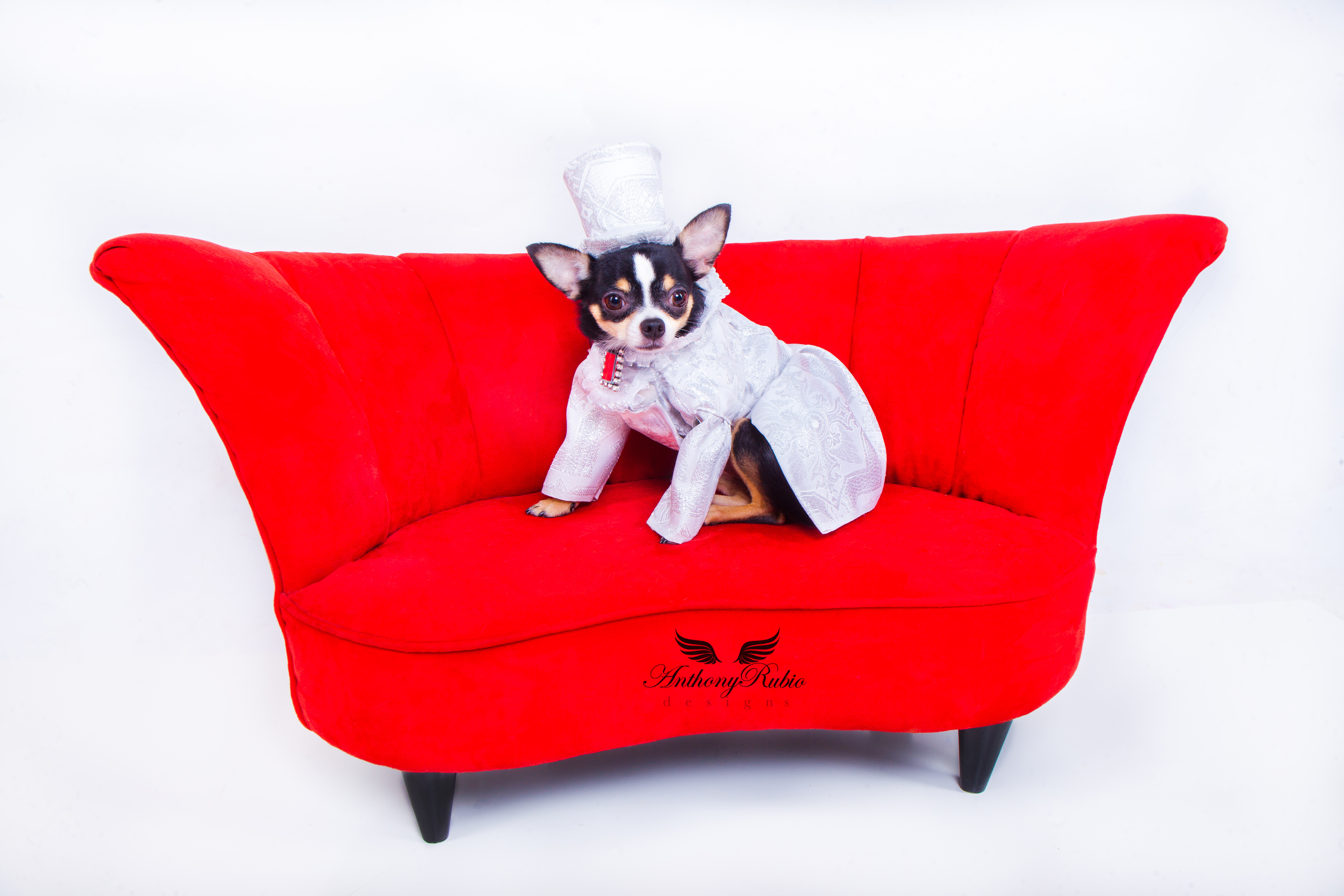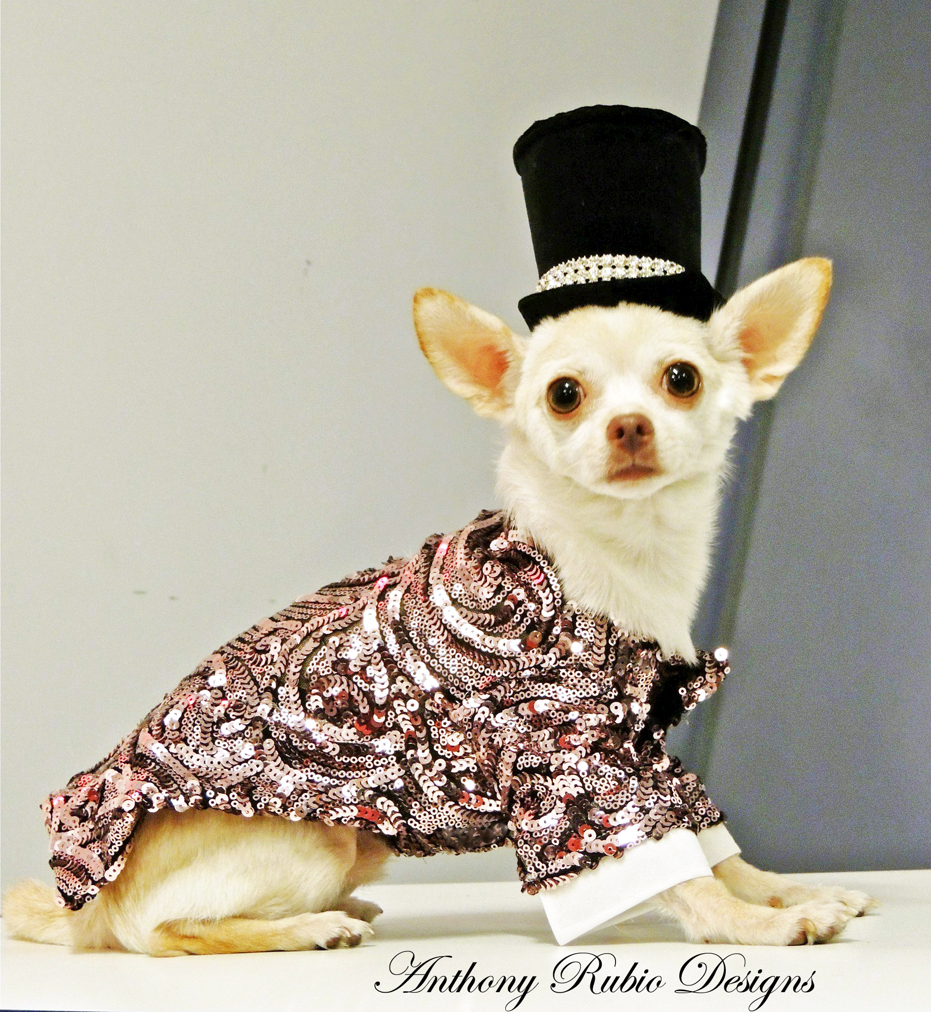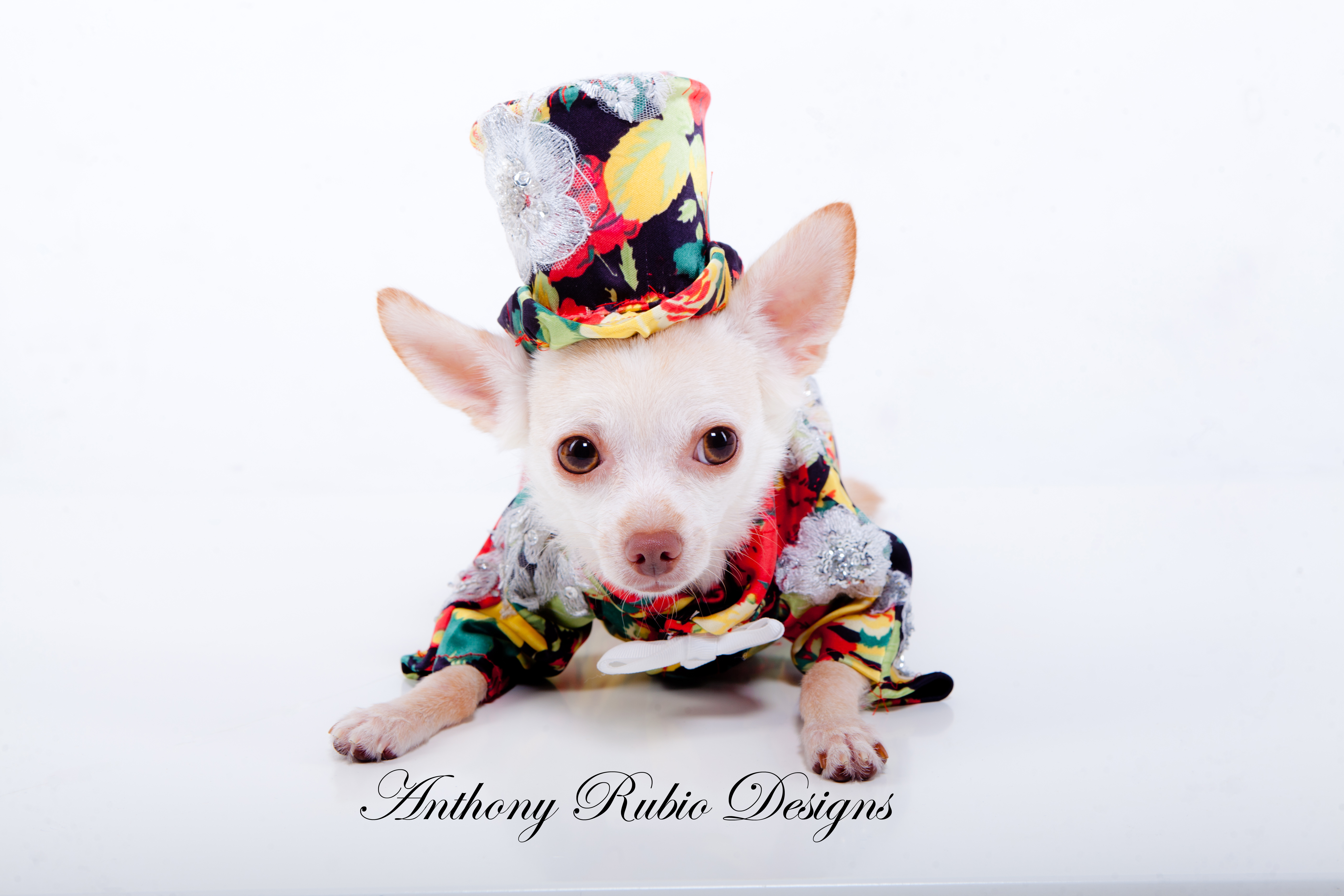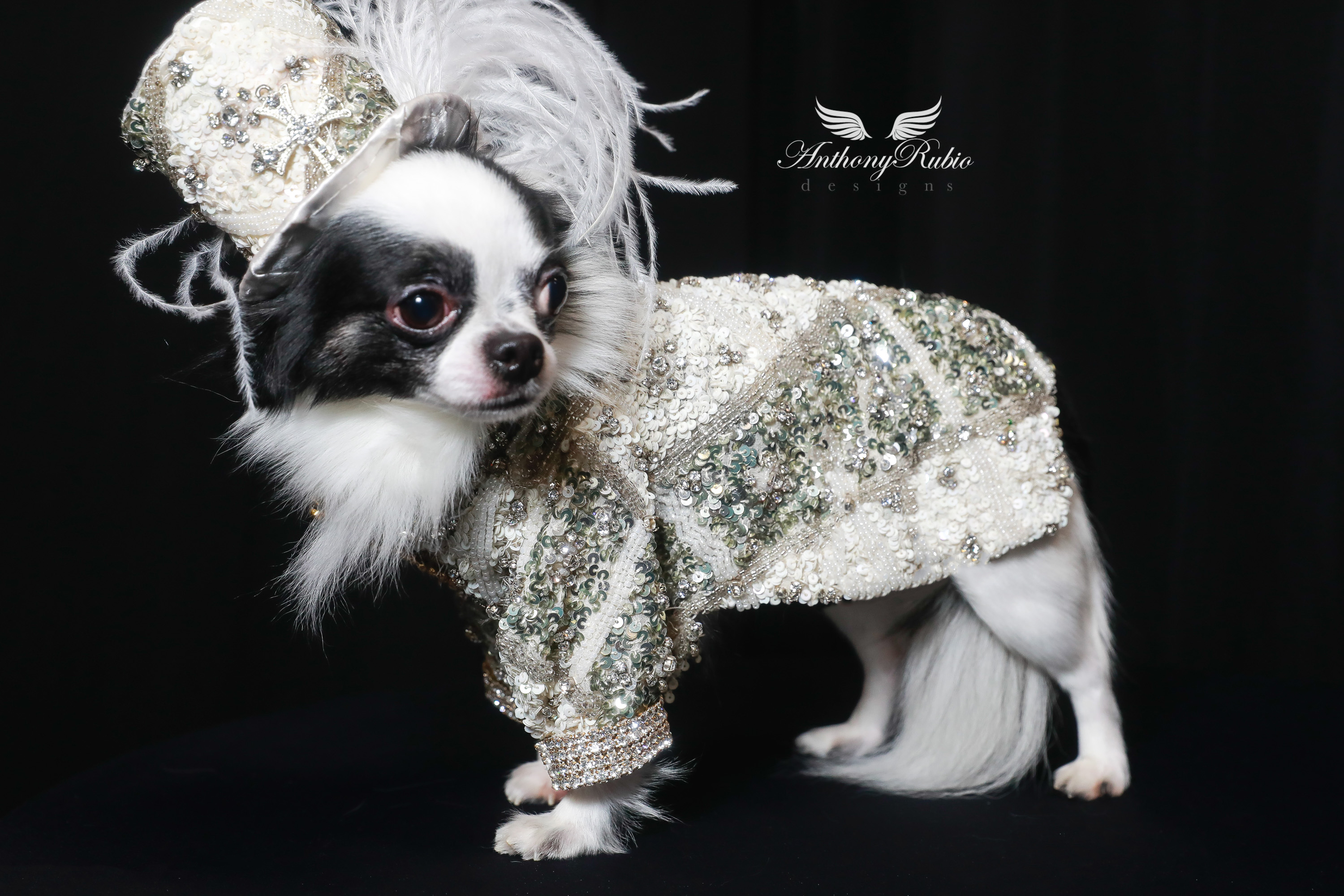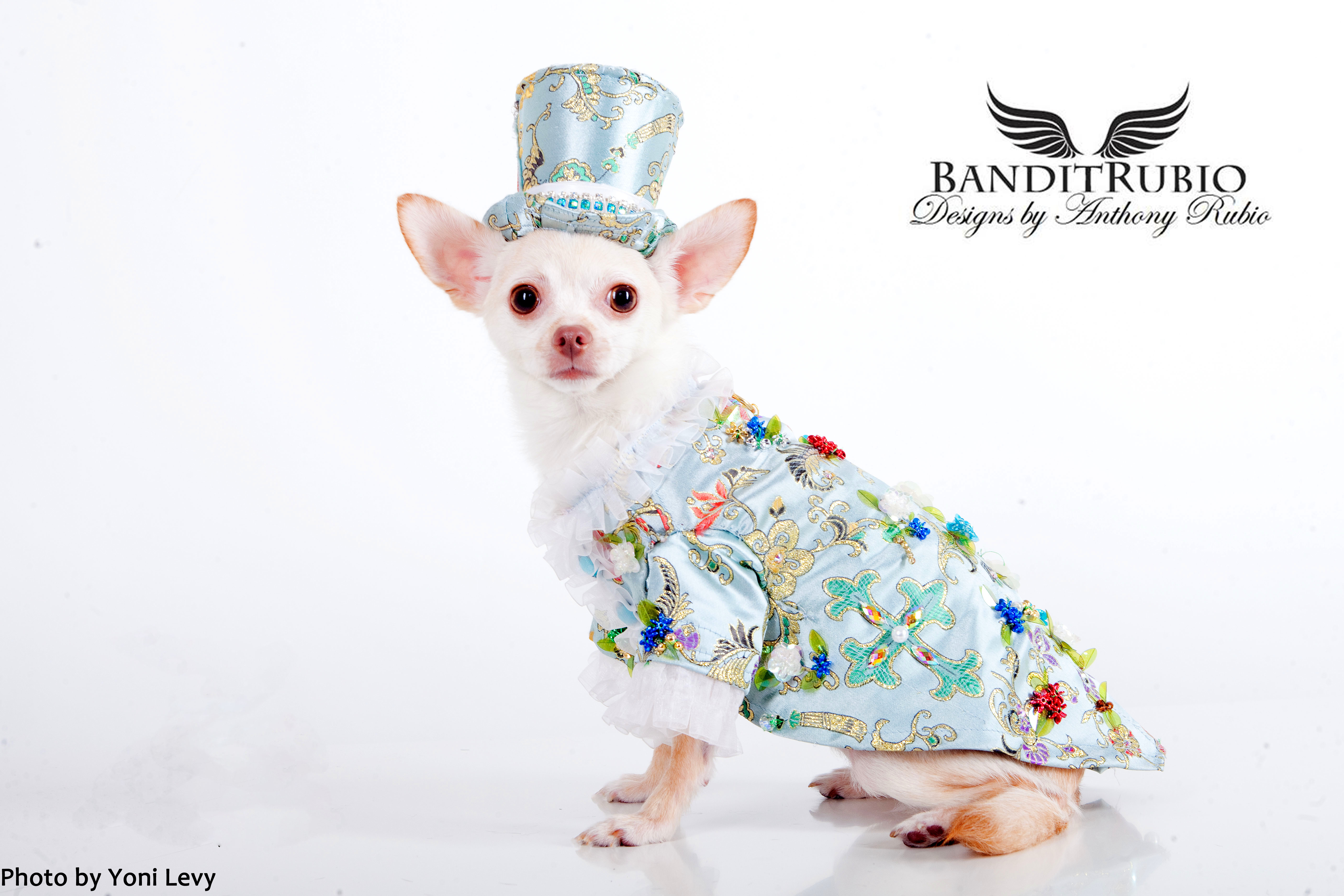 Dog Fashion by Pet Couturier Anthony Rubio. Model is Chihuahua Bogie.