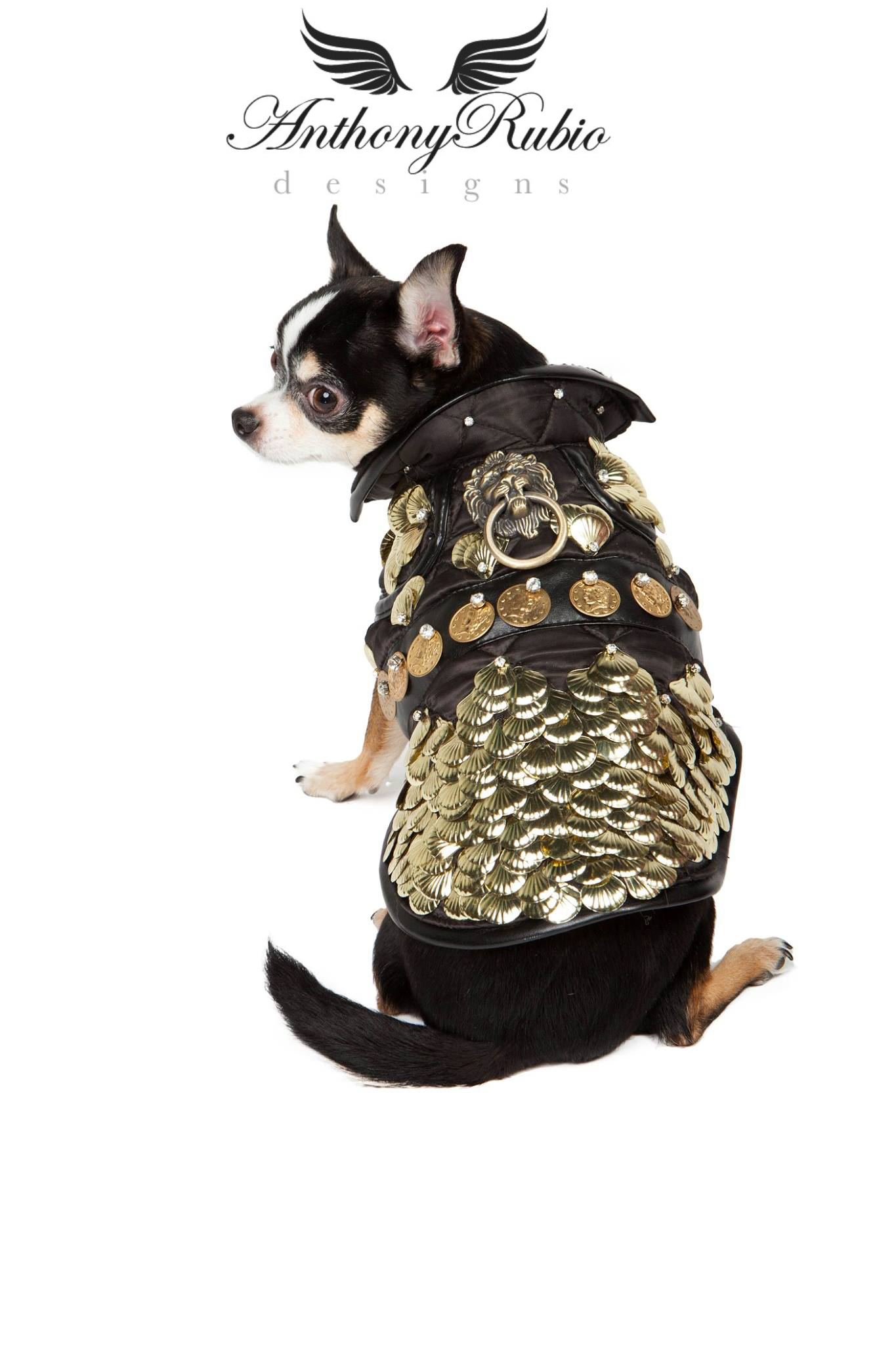 Anthony Rubio Designs pays homage with a nod to Romanesque architecture a style of medieval European decent.#ChihuahuaBogie is looking every bit the warrior in a stylish quilted coat totally hand embellished in gold shells, roman coins with crystals featuring a miniature bronzed lion’s head door knocker for leash attachment. With these harsh Winters one must keep sensibly warm and look fearless. #PetFashion#CanineCouture