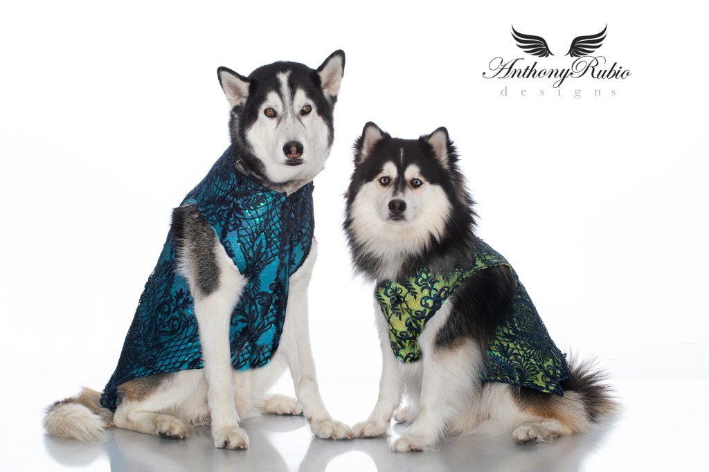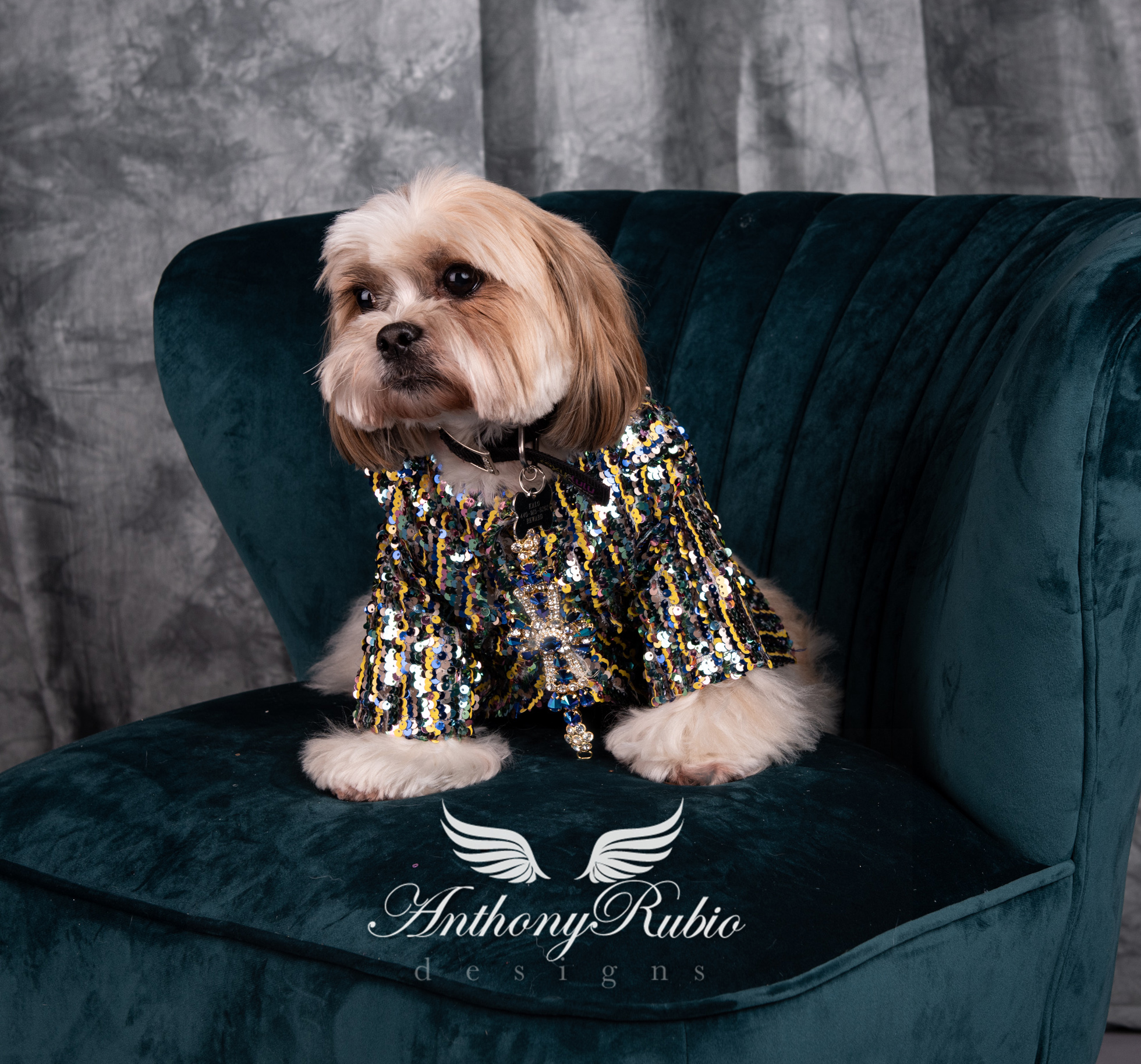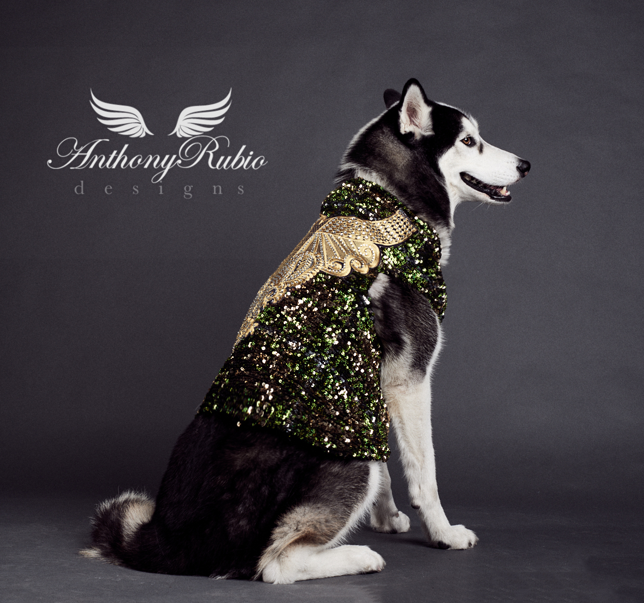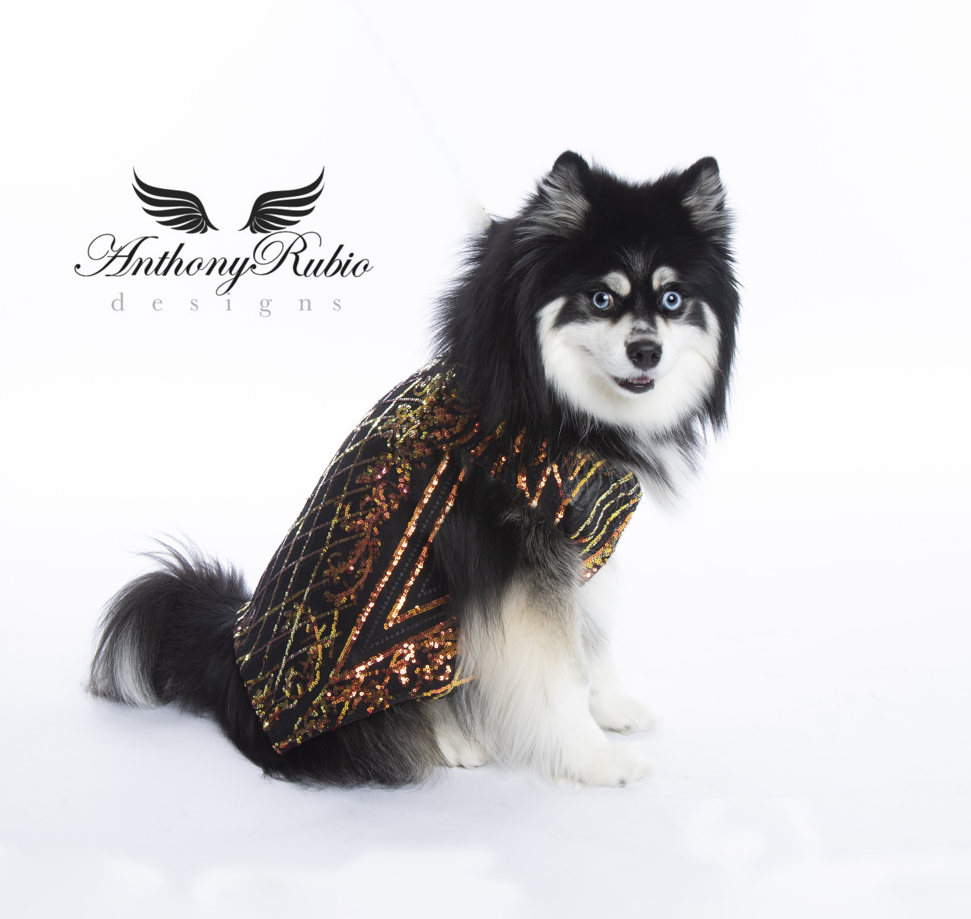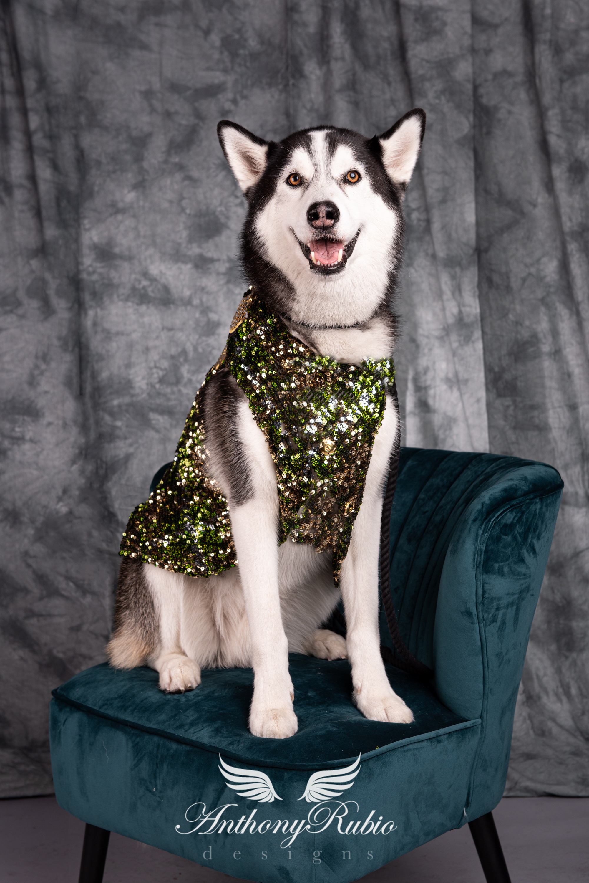 Yes, even boys can wear sequins. Bandit the Rescued Husky who has graced the Anthony Rubio Designs runways is here proudly modeling a sequined vest perfect for any season. Anthony Rubio Designs for dogs of all sizes and they are loving it.