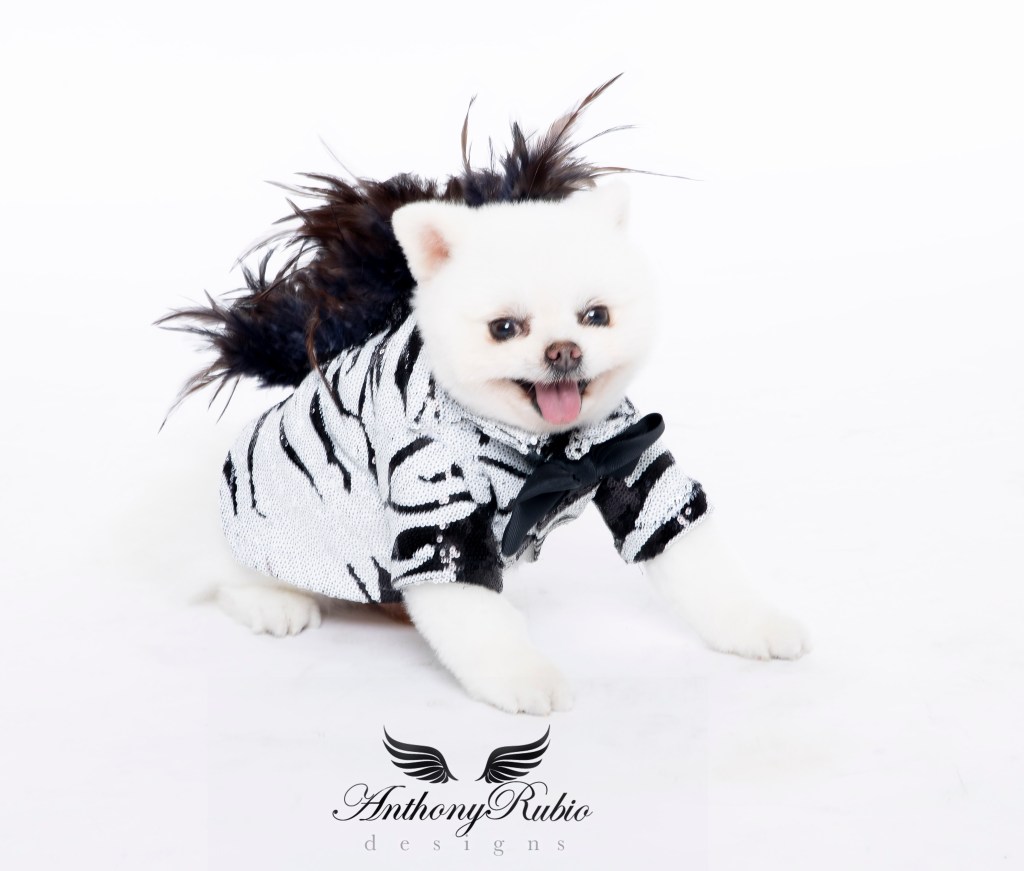 Milk the #Pomeranian in his bespoke sequined Zebra tuxedo. This tuxedo features a mane of incredible plumage and a black grosgrain bow tie. I am so sure that Milk is going to steal everyone’s heart.